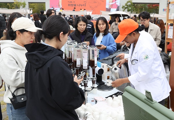 Çà»ç ÇöÀå¿¡¼´Â °£´ÜÇÑ ¹®´äÀ» ÅëÇØ °³ÀÎÀÇ Ä¿ÇÇ ¼ºÇâÀ» ¾Ë¾Æº¸´Â ¡®Ä¿ÇÇMBTI¡¯ ÇÁ·Î±×·¥ÀÌ Å« È£ÀÀÀ» ¾ò¾ú´Ù. ¹æ¹®°´µéÀº °á°ú¿¡ µû¶ó Ãßõ Ä¿ÇǸ¦ ½ÃÀ½Çϸç ÀڽŸ¸ÀÇ ¡®ÃëÇâ ¿©Ç࡯À» °æÇèÇß´Ù. ƯÈ÷ Çà»ç ÇÑÁ¤ ¸Þ´º·Î ¼±º¸ÀÎ ¡®¿ÍÇÃÄÜ ¶ó¶¼¡¯´Â ´ÞÄÞÇÑ ¿ÍÇÃÄܰú ÁøÇÑ ¶ó¶¼¸¦ °áÇÕÇÑ ÀÌ»ö ¸Þ´º·Î, ÀþÀº ¹æ¹®°´µé »çÀÌ¿¡¼ ¡°¿ÃÇØ Ä¿ÇÇ»êÃ¥ÀÇ ½Ã±×´Ïó¡±¶ó´Â Æò°¡¸¦ ¹Þ¾Ò´Ù.