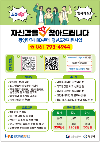 Âü¿©¸¦ Èñ¸ÁÇϴ û³âÀº °í¿ë24 ´©¸®Áý(www.work24.go.kr)¿¡¼ ½ÅûÇÒ ¼ö ÀÖÀ¸¸ç, ÀÚ¼¼ÇÑ »çÇ×Àº ±¤¾ç¸¸±ÇHRD¼¾ÅÍ(¢Ï061-793-4944)·Î ¹®ÀÇÇÏ¸é ¾È³»¹ÞÀ» ¼ö ÀÖ´Ù.