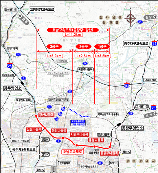È£³²°í¼Óµµ·Î È®Àå°ø»ç´Â ÃÑ 7934¾ï¿øÀ» ÅõÀÔÇØ µ¿±¤ÁÖICºÎÅÍ ±¤»êIC±îÁö ÃÑ 11.2§° ±¸°£À» ±âÁ¸ ¿Õº¹ 4Â÷·Î¿¡¼ 6Â÷·Î·Î È®ÀåÇÏ´Â ´ë±Ô¸ð µµ·Î ±â¹Ý½Ã¼³ °³¼± »ç¾÷ÀÌ´Ù. ÀÌ ±¸°£¿¡´Â ¡ãµ¿±¤ÁÖIC ¡ã¿ëºÀIC ¡ã¼±¤ÁÖIC ¡ãµ¿¸²IC ¡ã»ê¿ùIC ¡ã±¤»êIC°¡ Æ÷ÇԵǸç, °ø»ç´Â ¿À´Â 2029³â±îÁö ´Ü°èÀûÀ¸·Î ¿Ï·áÇÒ ¿¹Á¤ÀÌ´Ù.