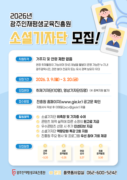 | ±¤ÁÖÀÎÀçÆò»ý±³À°ÁøÈï¿ø, 2026 ¼Ò¼È±âÀÚ´Ü ¸ðÁý -2°³ ºÐ¾ß, 15¸í ¼±¹ß ¡¦ Æ®·»µðÇÑ Æò»ýÇнÀ ÄÜÅÙÃ÷ ¹ß±¼ ±â´ë- |