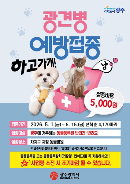 ±¤Áֽô ¸Å³â º½°ú °¡À» µÎ Â÷·Ê ±¤°ßº´ ¿¹¹æÁ¢Á¾ »ç¾÷À» ½Ç½ÃÇϰí ÀÖ´Ù. Á¢Á¾ ´ë»óÀº ±¤Áֽà °ÅÁÖ ¹Ý·Á°ß¡¤¹Ý·Á¹¦ÀÌ´Ù. ´Ü, ÀӽŠ¶Ç´Â ÀÌ»ó ¼Ò°ßÀÌ ÀÖ´Â °æ¿ì¿¡´Â Á¢Á¾ÀÌ ¾È µÉ ¼ö ÀÖ´Ù.