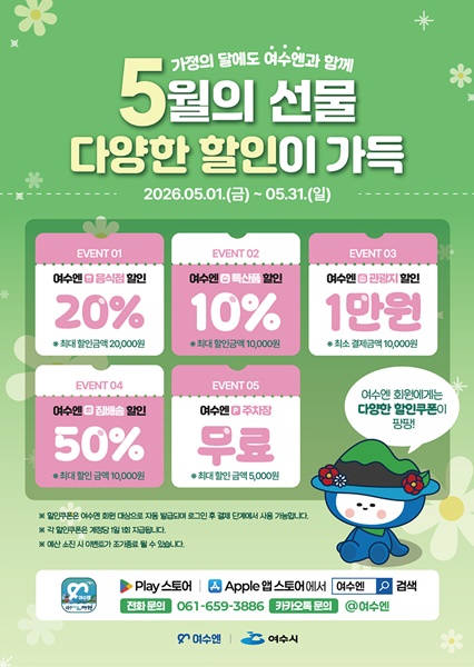 ¿©¼ö½Ã(½ÃÀå Á¤±â¸í)´Â 5¿ù °¡Á¤ÀÇ ´ÞÀ» ¸Â¾Æ ½º¸¶Æ®°ü±¤ ÅëÇÕÇ÷§Æû ¡®¿©¼ö¿£¡¯À» ÅëÇØ ÇÒÀÎ ÇÁ·Î¸ð¼Ç°ú °ÅºÏ¼±ÃàÁ¦ ¿¬°è À̺¥Æ®¸¦ ¿î¿µÇÑ´Ù°í ¹àÇû´Ù.
