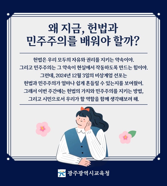 ±¤Áֽñ³À°Ã»(±³À°°¨ ÀÌÁ¤¼±)ÀÌ ¿À´Â 12¿ù 3~14ÀÏ ¡®2024³â 12¡¤3 ºñ»ó°è¾ö¡¯ 1³âÀ» ¸Â¾Æ ¡®2025³â Çå¹ý°ú ¹ÎÁÖÁÖÀÇ ¼öÈ£ ±â°£¡¯À» ¿î¿µÇÑ´Ù.