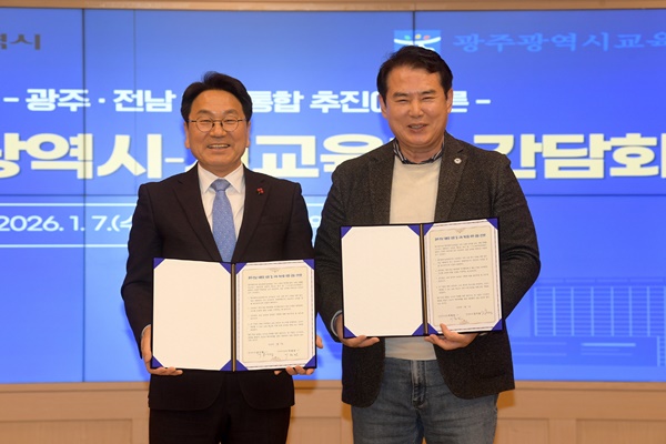 ±¤ÁÖ½Ã¿Í ½Ã±³À°Ã»ÀÌ ¡®±¤ÁÖ¡¤Àü³² ´ëÅëÇÕ ¼º°ø°ú ±³À°Çõ½ÅÀ» À§ÇÑ °øµ¿¼±¾ð¹®¡¯À» ¹ßÇ¥Çϰí, ¡®±¤ÁÖ¡¤Àü³² ÇàÁ¤ÅëÇÕ¡¯ ÃßÁø¿¡ µû¸¥ ±³À°Çõ½Å ¹æ¾È ³íÀÇ¿¡ º»°Ý Âø¼öÇß´Ù.