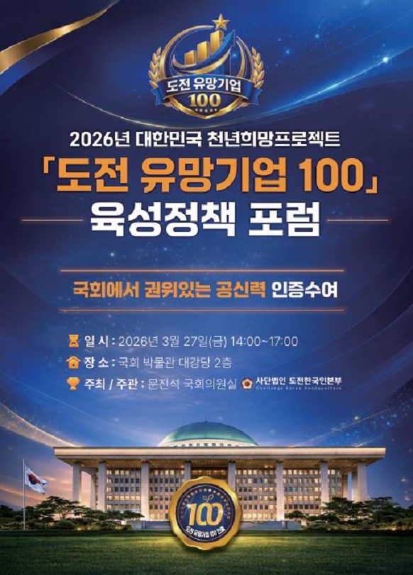 ´ëÇѹα¹ÀÇ ¹Ì·¡ ¼ºÀå±â¾÷À» Á¶¸íÇÏ´Â ¡¸2026 µµÀü À¯¸Á±â¾÷ 100 ÀÎÁõ ¹× À°¼ºÁ¤Ã¥ Æ÷·³¡¹ÀÌ 3¿ù 27ÀÏ ±¹È¸ ¹Ú¹°°ü ´ë°´ç¿¡¼ ¾à 300¿© ¸íÀÌ Âü¼®ÇÑ °¡¿îµ¥ ¼ºÈ²¸®¿¡ °³ÃֵƴÙ. À̹ø Çà»ç´Â ¹®Áø¼® ±¹È¸ÀÇ¿ø½Ç°ú »ç´Ü¹ýÀÎ µµÀüÇѱ¹Àκ»ºÎ°¡ °øµ¿ ÁÖÃÖ¡¤ÁÖ°üÇßÀ¸¸ç, ±â¾÷Àΰú Àü¹®°¡, ±¹È¸ °ü°èÀÚ µî °¢°è ÁÖ¿ä ÀλçµéÀÌ Âü¼®ÇØ Àǹ̸¦ ´õÇß´Ù.
