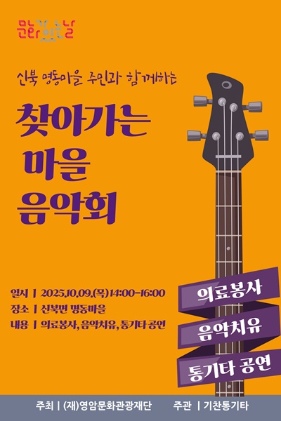 (Àç)¿µ¾Ï¹®È°ü±¤Àç´ÜÀº 2025 ¹®È°¡ ÀÖ´Â ³¯ Çà»çÁö¿ø »ç¾÷À¸·Î »ýȰ¹®È µ¿È£È¸ÀÎ ±âÂùÅë±âŸ(´ëÇ¥:ÃÖ¹®ÀÏ)¿Í ÇÔ²² ½ÅºÏ ¸íµ¿¸¶À» ÁÖ¹ÎÀ» ´ë»óÀ¸·Î ÇÑ ¡®Ã£¾Æ°¡´Â ¸¶À» À½¾Çȸ¡¯¸¦ ¿À´Â 10¿ù 9ÀÏ(¸ñ) Çѱ۳¯¿¡ °³ÃÖÇÑ´Ù°í ¹àÇû´Ù.