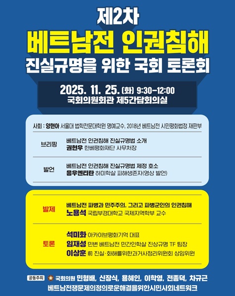 | ¹ÎÇü¹è ÀÇ¿ø, ¡°Á¦2Â÷ º£Æ®³²Àü ÀαÇÄ§ÇØ Áø½Ç±Ô¸íÀ» À§ÇÑ ±¹È¸ Åä·Ðȸ¡±°³ÃÖ - ±¹È¸¿¡¼ ÃÖÃÊ·Î ¿¸®´Â º£Æ®³²Àü ÆÄº´±ºÀÎ ÀαÇÄ§ÇØ ³íÀÇ °ø°³ Åä·Ðȸ |