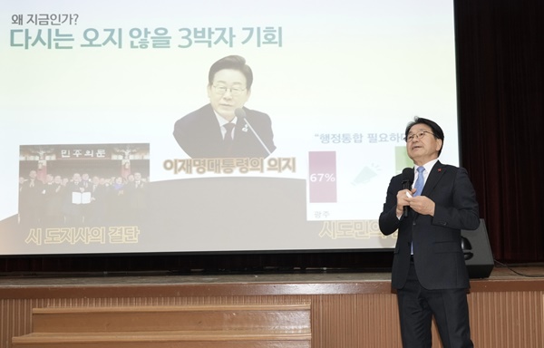 ° ½ÃÀåÀº ¡°¸ðµç ºÒÀÌÀÍÀº ¹èÁ¦ÇÏ°í ±¹ÀÚ Áö¿øÀº ´õ Ưº°ÇÏ°Ô Çϰڴٴ °ÍÀÌ ±¤ÁÖÀü³² ÅëÇÕÀÇ ´ë¿øÄ¢¡±À̶ó¸ç ¡°¿¬ 5Á¶¿ø¿¡ ´ÞÇÏ´Â ÀçÁ¤ ¹× °ø°ø±â°ü ¿ì¼± Áö¿ø, Ưº°½Ã ÁöÀ§ ºÎ¿© µî Á¤ºÎÀÇ ÀüÆøÀûÀÎ ÀçÁ¤ Áö¿ø°ú ½Ãµµ¹ÎÀÇ ¿°¿øÀÌ Çѵ¥ ¾î¿ì·¯Áú ¶§ 3Àü4±â ÇàÁ¤ÅëÇÕÀº ¼º°øÇÒ ¼ö ÀÖ´Ù¡±°í ¼³¸íÇß´Ù.
