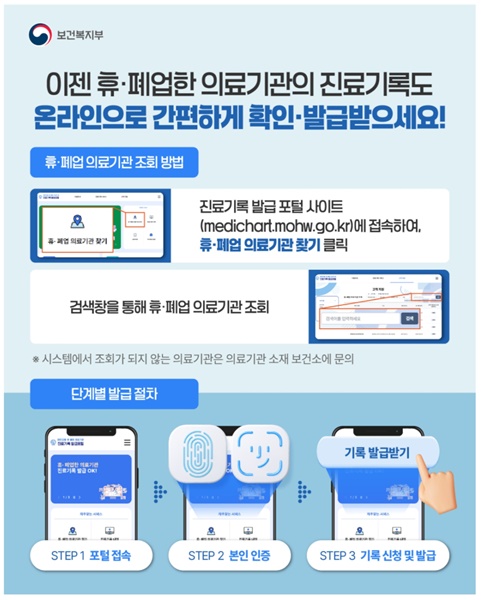 ÈÞ¡¤Æó¾÷ ÀÇ·á±â°ü Áø·á±â·Ïº¸°ü½Ã½ºÅÛÀº º´¡¤ÀÇ¿øÀÌ ¹®À» ´Ý¾Æµµ ȯÀÚÀÇ Áø·á±â·ÏÀ» ¾ÈÀüÇÏ°Ô º¸°üÇϰí, ÇÊ¿ä½Ã ¿Â¶óÀÎÀ¸·Î ¿¶÷Çϰųª »çº»À» ¹ß±Þ¹ÞÀ» ¼ö ÀÖµµ·Ï Áö¿øÇÏ´Â ¼ºñ½º´Ù. Áö³ÇØ 7¿ù 21ÀϺÎÅÍ º»°Ý ½ÃÇàµÆ´Ù.