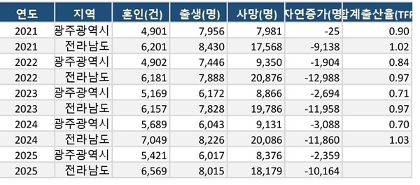 ½ÇÁ¦·Î Àü³²°ú ±¤ÁÖÀÇ Àα¸ ±¸Á¶´Â ½É°¢ÇÑ »óȲ¿¡ ³õ¿© ÀÖ´Ù. 2024³â ±âÁØ ±¤ÁÖ´Â Ãâ»ý¾Æ 6,043¸í, »ç¸ÁÀÚ 9,131¸íÀ¸·Î ÀÚ¿¬Áõ°¡´Â –3,088¸íÀ» ±â·ÏÇß°í, ÇÕ°èÃâ»êÀ²µµ 0.70±îÁö ¶³¾îÁ³´Ù. Àü³² ¿ª½Ã Ãâ»ý¾Æ 8,226¸í, »ç¸ÁÀÚ 2¸¸86¸íÀ¸·Î ÀÚ¿¬Áõ°¡ –1¸¸1,860¸íÀ» ±â·ÏÇϸç Áö¹æ ¼Ò¸ê À§±â°¡ Çö½Çȵǰí ÀÖ´Â »óȲÀÌ´Ù.